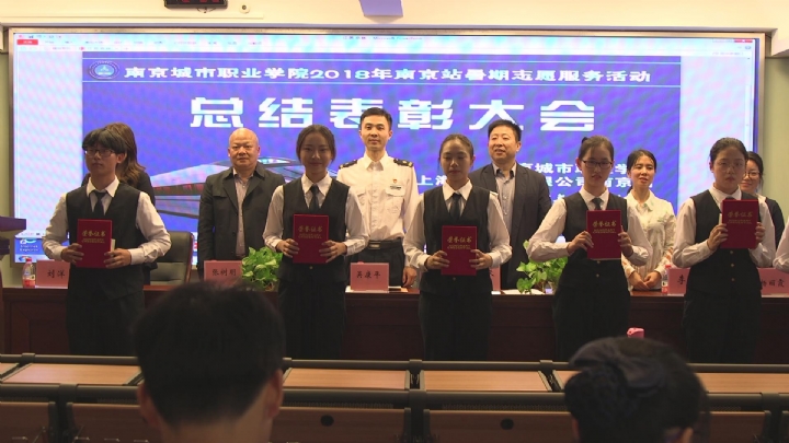 表彰会上,首先由江苏动铁集团马丽娅老师对本次暑期实践活动进行了总结,和学生一起观看了学生暑运实习小视频。张树明副校长宣读了表彰决定,南京站团委吴康平书记为玄武校区颁发“优秀组织奖”铜牌,主席台领导为荣获“突出贡献志愿者”和“优秀志愿者”的同学颁奖。