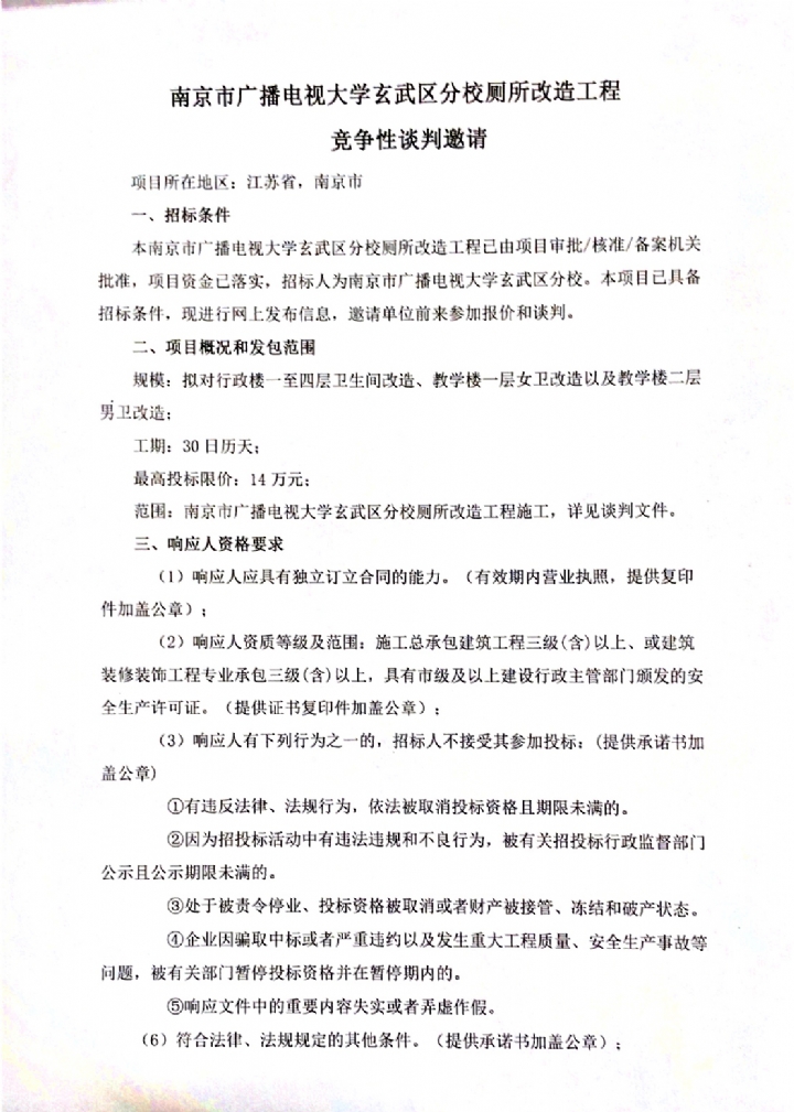 南京市广播电视大学玄武区分校厕所改造工程 竞争性谈判邀请