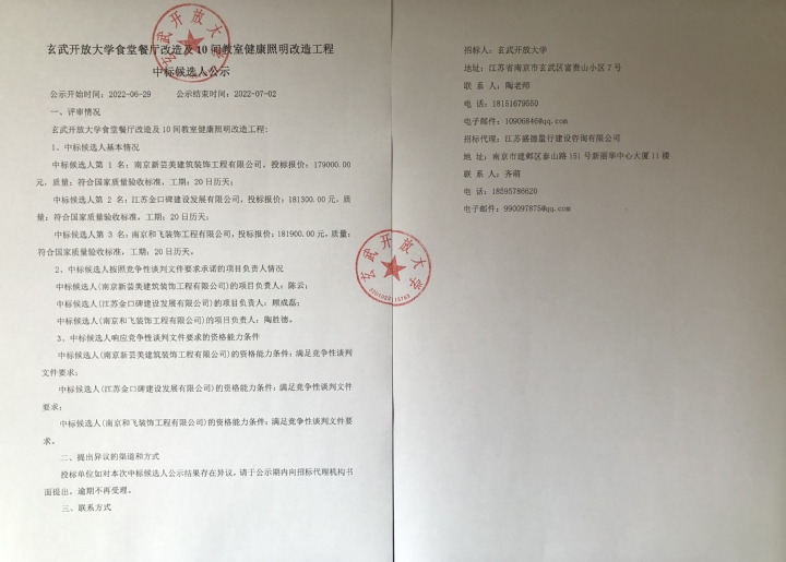 米兰平台食堂餐厅改造及10间教室健康照明改造工程 中标候选人公示