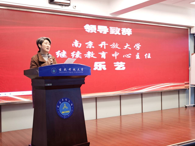 开学典礼在庄严的国歌声中拉开帷幕。南京开放大学继续教育中心主任乐艺致辞。她强调成人教育对终身学习和个人成长的重要意义,勉励学员要珍惜学习机会,勇攀知识高峰,努力提升自己的技能和素养,在各自的岗位上发光发热,为社会的发展贡献自己的力量。