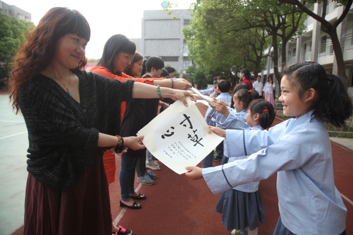 接着,孩子们跟着国术老师黄凯学习了太极桩功的基本动作和呼吸吐纳法,有效提高了注意力,舒缓了心境之后,分别进入硬笔和软笔教室体验了独具特色的书法教学,结合当天的节日,朱琳老师和祝泸鹏老师首先讲解了国学经典〈弟子规〉“入则孝”篇章,并指导孩子学习写下名诗《游子吟》。在老师们的悉心指导下,孩子们写出了令自己满意的作品,并把作品献给了妈妈,现场充满了温馨、愉悦的氛围。