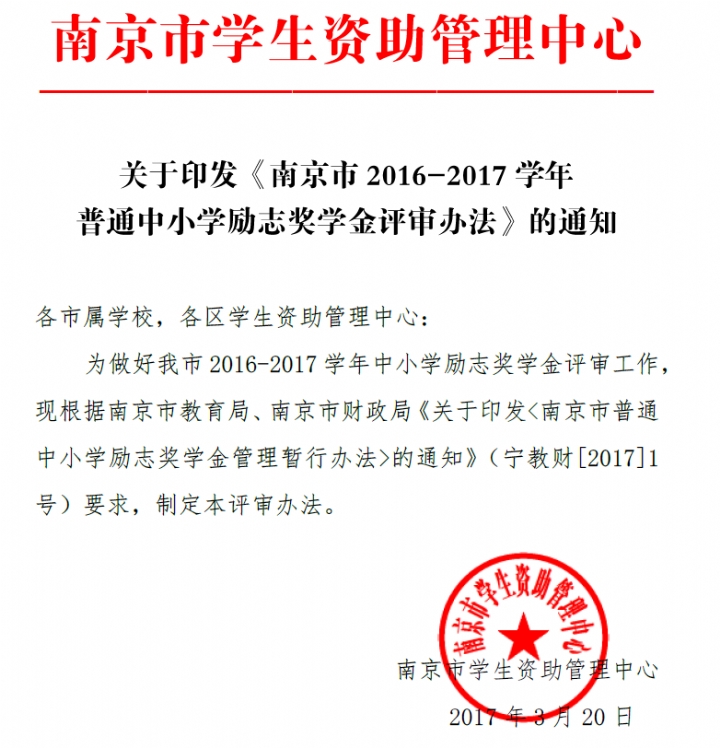 南京市2016-2017学年普通中小学励志奖学金评审办法