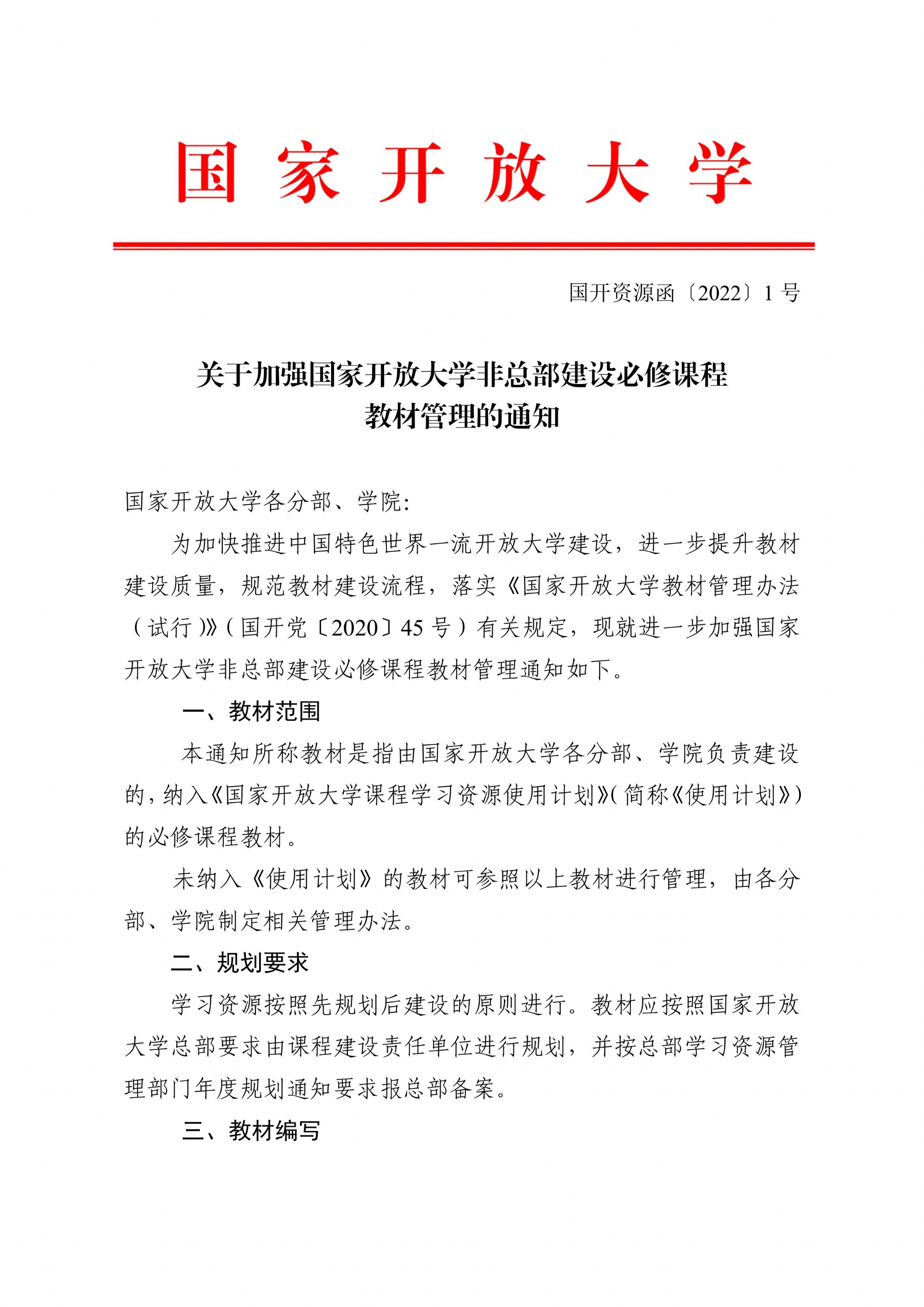 关于加强国家开放大学非总部建设必修课程教材管理的通知(国开资源函〔2022〕1 号)