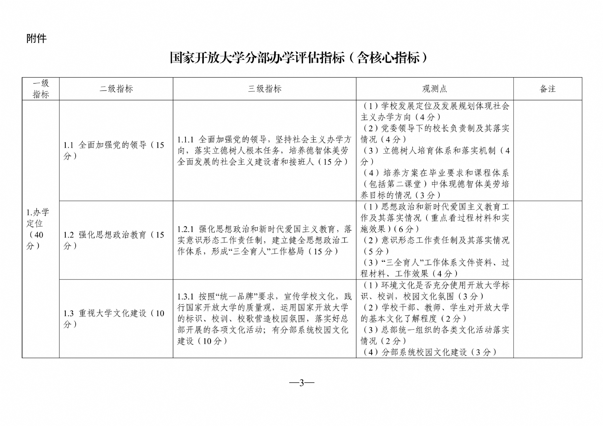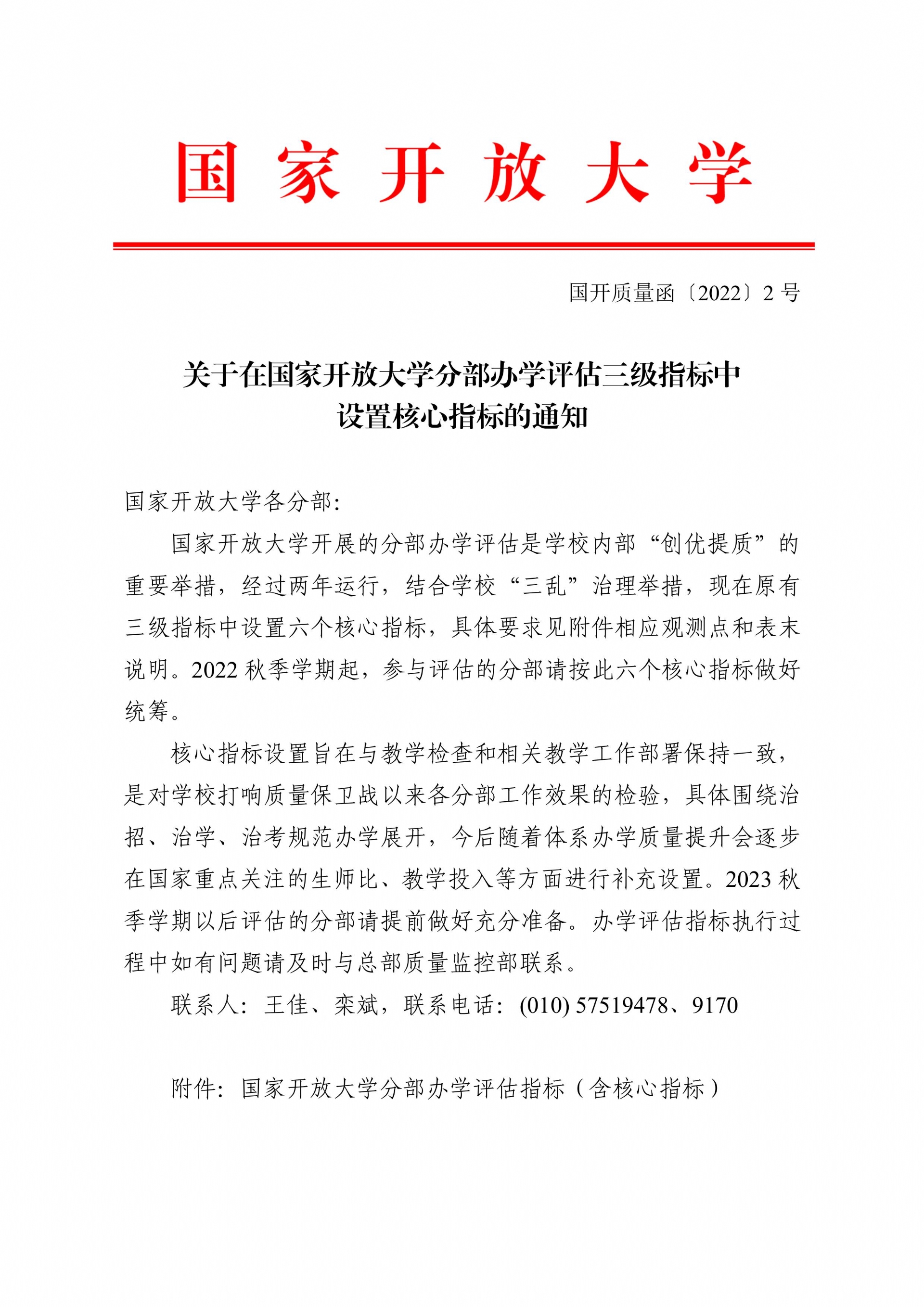 关于在国家开放大学分部办学评估三级指标中设置核心指标的通知